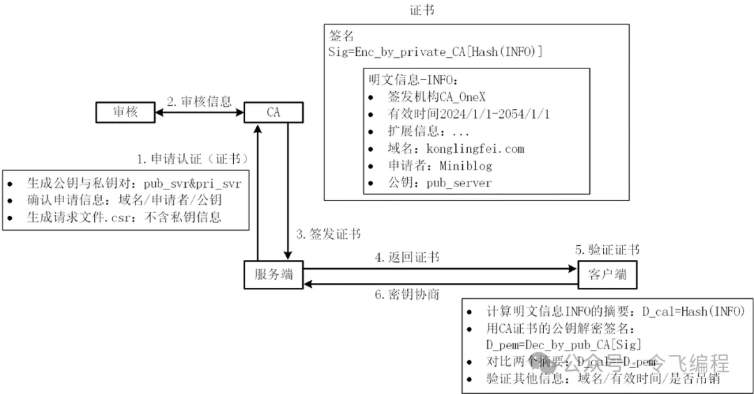 (1) 服务端向第三方机构 CA 提交公钥、组织信息、个人信息(如域名)等内容并申请认证(无需提交私钥);