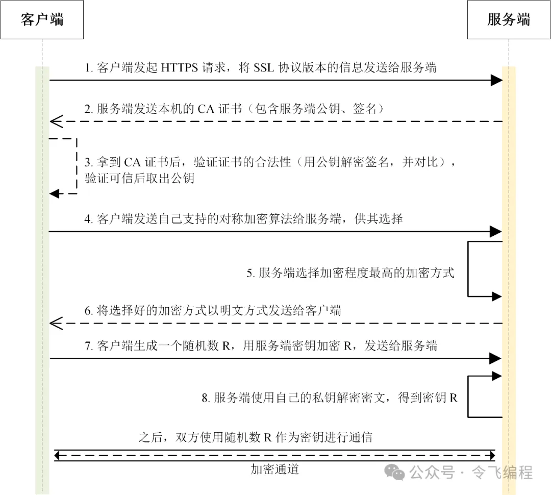 (6) 客户端生成一个随机数 R,并用服务端证书中的公钥加密后发送给服务端。服务端使用其私钥解密获取随机数 R,随后双方使用对称加密算法进行数据交换。