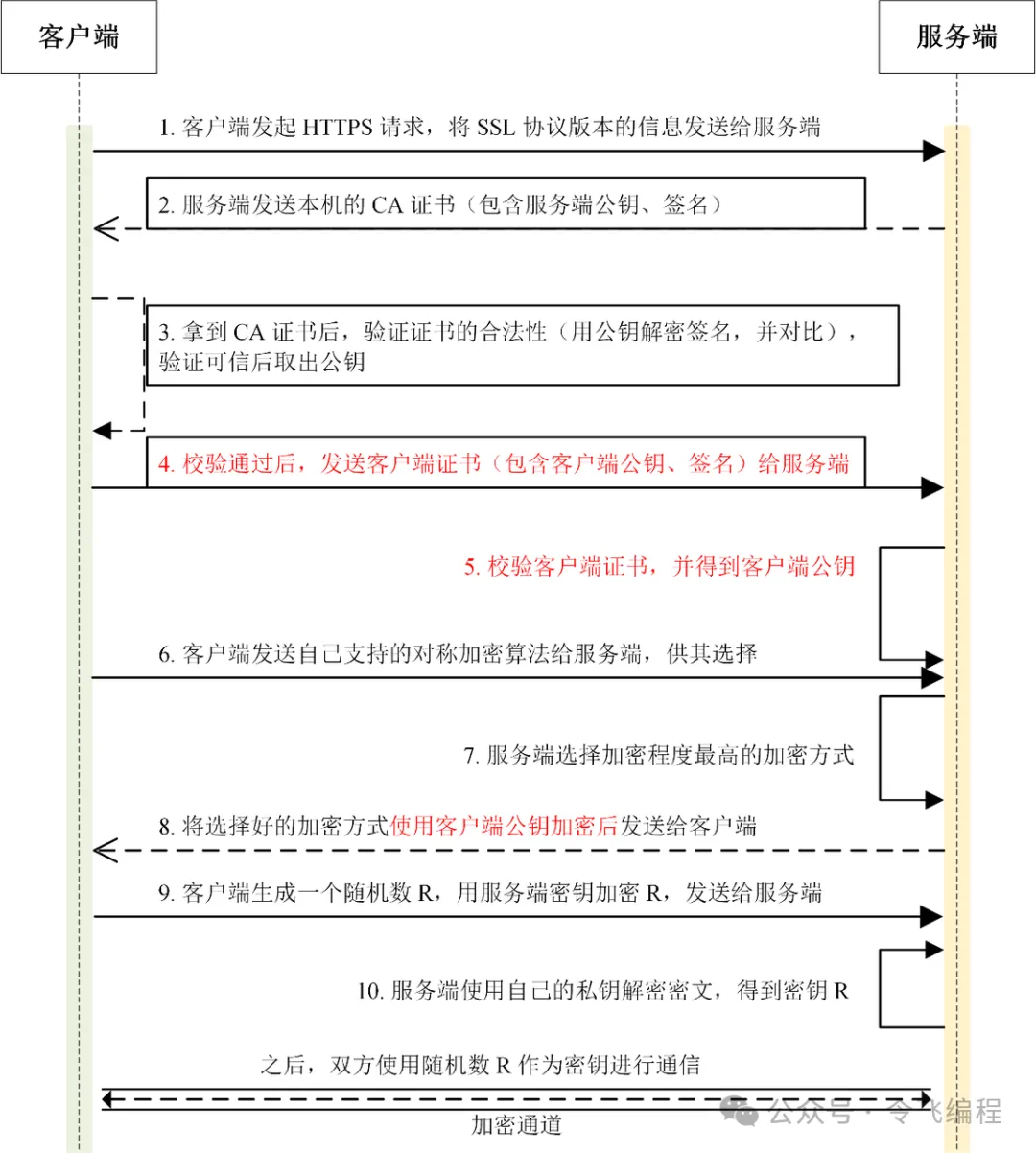 双向认证 SSL 握手过程与单向认证有所不同,其大部分步骤与单向认证过程相同。但在客户端成功验证服务器后,新增了服务器验证客户端的流程步骤。双向认证流程如下图所示。
