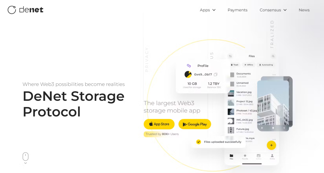 DeNet[3] 于 2017 年推出,是一种去中心化存储协议,允许利用全球备用存储,从而消除集中式数据中心。基于区块链和Web3原理构建,保证无与伦比的文件安全;文件是碎片化的、加密的,并且只能由所有者解密。用户可以享受增强的隐私,因为不需要个人数据,并且文件存储在有弹性的去中心化网络中。