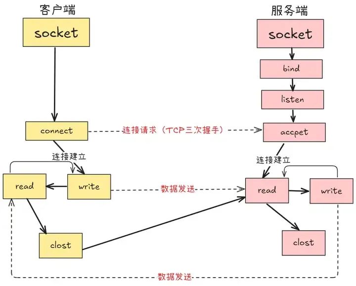 服务端和客户端初始化 socket,得到文件描述符;服务端调用 bind,绑定 IP 地址和端口;服务端调用 listen,进行监听;服务端调用 accept,等待客户端连接;客户端调用 connect,向服务器端的地址和端口发起连接请求;服务端 accept 返回 用于传输的 socket的文件描述符;客户端调用 write 写入数据;服务端调用 read 读取数据;客户端断开连接时,会调用 close,那么服务端 read 读取数据的时候,就会读取到了 EOF,待处理完数据后,服务端调用 close,表示连接关闭。这里需要注意的是,服务端调用 accept 时,连接成功了会返回一个已完成连接的 socket,后续用来传输数据;所以,监听的 socket 和真正用来传送数据的 socket,是「两个」 socket,一个叫作监听 socket,一个叫作已完成连接 socket;成功连接建立之后,双方开始通过 read 和 write 函数来读写数据,就像往一个文件流里面写东西一样。