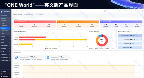 在新推出的 Bonree ONE 2025 春季版中,博睿数据正式推出国际化版本,支持中英文切换,满足海外客户需求。具体而言,博睿数据推出英文版官网(en.bonree.com)、英文版产品页面,以及英文版本的产品使用文档,帮助海外用户更好地了解博睿数据的产品能力,以及产品功能使用。此外,博睿数据还调整定价策略,从收费模式和计价单位等符合国际标准,满足海外客户的使用习惯。