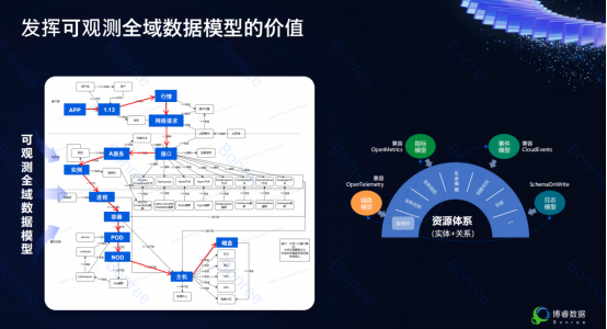 到了 2023 年,博睿数据引入 AI 算法、日志分析能力、统一存储引擎,来构建统一的数据分析基础,提升用户的运维效率。同时,用户还可以通过数据集成和 ETF 工具接入第三方数据,完善可观测的核心能力。2024 年,博睿数据对产品进行了创新,定义了可观测体系的全域数据模型,包括实体、指标、事件、日志、调用链、记录、元属性。依据模型定义,用户可快速了解数据结构,让数据使用更明确可控。