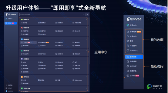 在用户体验方面,博睿数据推出“即用即享”式全新导航菜单,用户可根据需求自定义添加功能,并且支持收藏与最近访问记录,方便用户快速使用。同时,全新工作台整合告警、业务健康评分、事件中心,提供全局视角的运维优先级管理,助力企业高效决策。