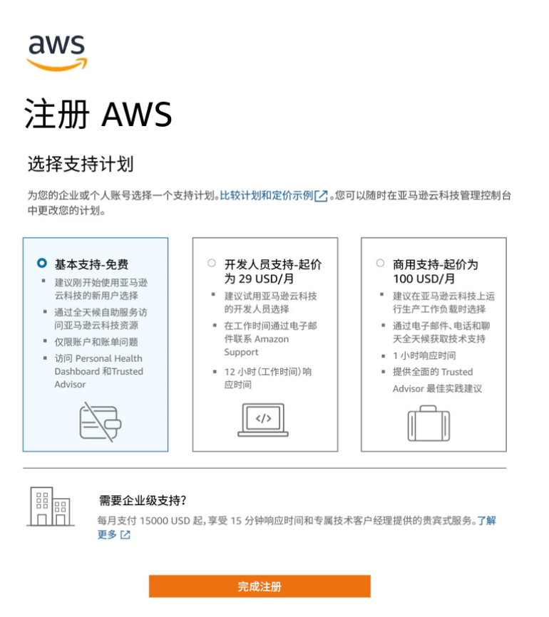 手机号、账单信息可以直接用国内资料填写;选择基础支持计划(无需额外开支);注册完成后等待身份验证通过,即可开始使用资源。