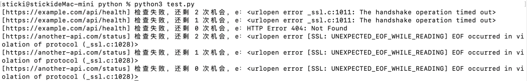 import json import urllib.request import logging import time # 日志配置 logger = logging.getLogger() logger.setLevel(logging.INFO) # 配置项 SERVICE_LIST = [ "https://example.com/api/health", "https://another-api.com/status" ] WEBHOOK_URL = "https://qyapi.weixin.qq.com/cgi-bin/webhook/send?key=your-key" # 每个服务失败最多重试几次 MAX_RETRY = 3 RETRY_INTERVAL_SECONDS = 1# 每次失败后等待时间(秒) def lambda_handler(event, context): logger.info("开始服务健康检查") alerts = [] for url in SERVICE_LIST: name = get_service_name(url) ifnot check_with_retry(url, MAX_RETRY): alerts.append(f"服务异常:{name}\n地址:{url}") else: logger.info(f"[{name}] 服务正常") for msg in alerts: send_alert(WEBHOOK_URL, msg) logger.info("报警信息已发送") logger.info("服务健康检查完成") return { statusCode: 200, body: json.dumps(Health check completed.) } def check_with_retry(url, retries_left): try: with urllib.request.urlopen(url, timeout=3) as response: return200 <= response.status < 300 except Exception as e: logger.warning(f"[{url}] 检查失败,还剩 {retries_left - 1} 次机会,e:{e}") if retries_left > 1: time.sleep(RETRY_INTERVAL_SECONDS) return check_with_retry(url, retries_left - 1) else: returnFalse def send_alert(webhook_url, message): payload = { "msgtype": "text", "text": {"content": message} } data = json.dumps(payload).encode("utf-8") req = urllib.request.Request( webhook_url, data=data, headers={"Content-Type": "application/json"} ) try: with urllib.request.urlopen(req) as res: logger.info(f"Webhook 响应状态:{res.status}") except Exception as e: logger.error(f"发送报警失败:{e}") def get_service_name(url): return url.replace("https://", "").replace("http://", "").split("/")[0] # 方便本地调试 if __name__ == "__main__": lambda_handler({}, {})1.2.3.4.5.6.7.8.9.10.11.12.13.14.15.16.17.18.19.20.21.22.23.24.25.26.27.28.29.30.31.32.33.34.35.36.37.38.39.40.41.42.43.44.45.46.47.48.49.50.51.52.53.54.55.56.57.58.59.60.61.62.63.64.65.66.67.68.69.70.71.72.73.74.75.76.77.78.