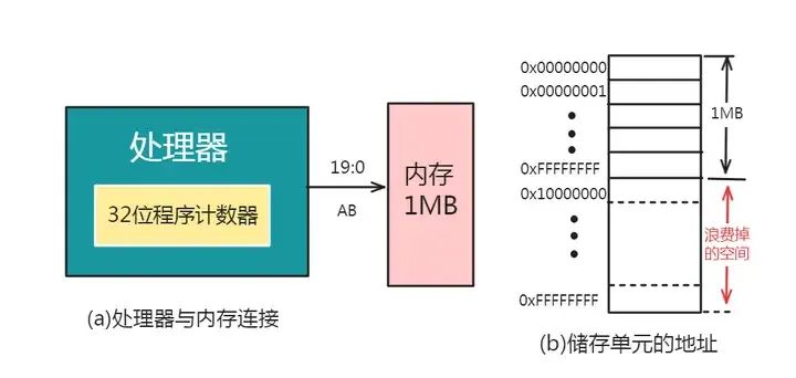另外,还有一些处理器因外部地址线的根数小于处理器程序计数器的位数,而使地址总线的根数不满足处理器的寻址范围,从而处理器的其余寻址能力也就被浪费了。例如:Intel8086处理器的程序计数器位32位,而处理器芯片的外部地址总线只有20根,所以它所能配置的最大内存为1MB: