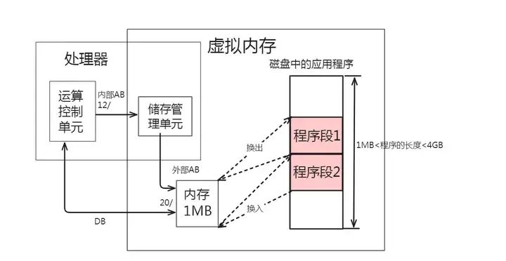 在计算机技术中,把内存中的程序段复制回辅存的做法叫做“换出”,而把辅存中程序段映射到内存的做法叫做“换入”。经过不断有目的的换入和换出,处理器就可以运行一个大于实际物理内存的应用程序了。或者说,处理器似乎是拥有了一个大于实际物理内存的内存空间。于是,这个存储空间叫做虚拟内存空间,而把真正的内存叫做实际物理内存,或简称为物理内存。