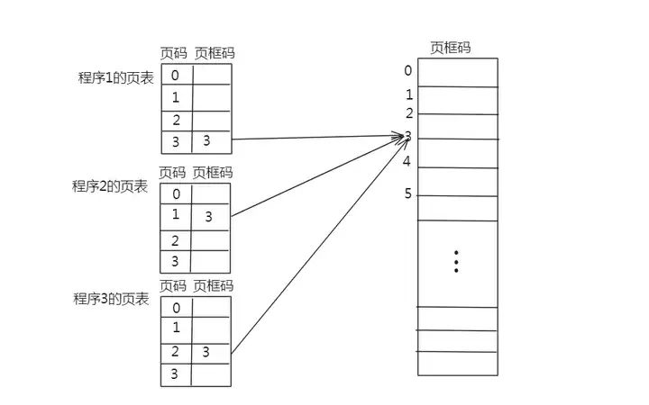 具体的方法是:使这些相关程序的虚拟空间的页面在页表中指向内存中的同一个页框。这样,当程序运行并访问这些相关页面时,就都是对同一个页框中的页面进行访问,而该页框中的页就被这些程序所共享。下图是3个程序共享一个页面的例子: