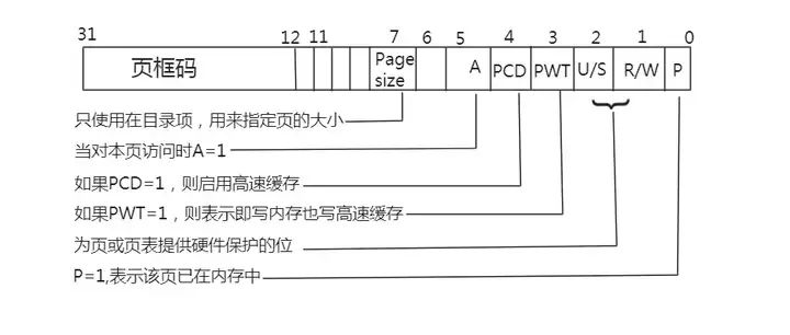 注意:如上文的“页的保护”部分,页框码代表物理地址,只需要高20位就够了(因为页框的长度为4KB,因此页内偏移12位)。而后12位可以存放各个状态信息和访问权限。但是Linux并没有这样做,反而重新定义了一个结构体来存放,通过“或”运算来将两者结合。