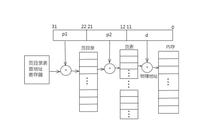 比如:一个程序的虚拟空间为4GB,页表以4KB为一页,那么这个程序空间就是1M页。为了存储这1M页的页指针,那么这个页表的长度就相当大了,对内存的负担也很大了。所以,最好对页表也进行分页存储,在程序运行时只把需要的页复制到内存,而暂时不需要的页就让它留在辅存中。为了管理这些页表页,还要建立一个记录页表页首地址的页目录表,于是单级页表就变成了二级页表。二级页表的地址转换如下图所示: