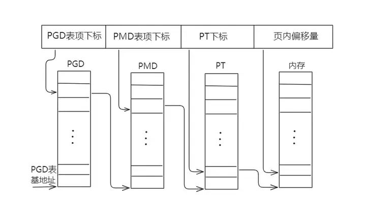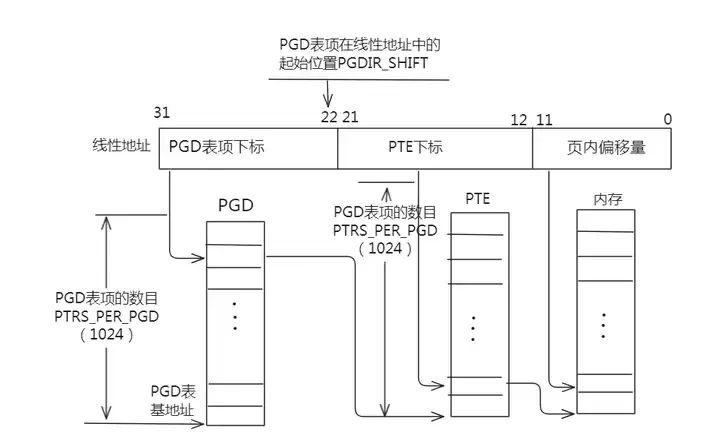 为了通用,Linux系统使用了三级页表结构:页目录、中间页目录和页表。PGD为顶级页表,是一个pgd_t数据类型(定义在文件linux/include/page.h中)的数组,每个数组元素指向一个中间页目录;PMD为二级页表,是一个pmd_t数据结构的数组,每个数组元素指向一个页表;PTE则是页表,是一个pte_t数据类型的数组,每个元素中含有物理地址。