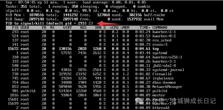 轻敲键盘上的小写字母 k。输入要结束进程的PID(进程标识号),然后按Enter键。如果您不确定PID,可以选择列表中的第一个。例如,要停止PID为23的进程,输入23后按Enter。