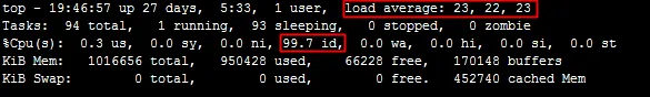 Linux系统上暂时没有运行任何业务程序。通过使用top命令查看时,我们注意到CPU的使用率其实并不高,但奇怪的是,CPU的负载(load average)却显得异常高,就像下面的截图所展示的一样。