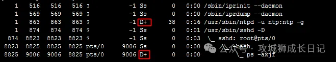 可以通过 ps -axjf 命令来检查系统中是否存在处于 D+ 状态的进程。如果发现有进程处于这种状态,它们暂时既不能被手动终止,也无法自行退出。解决这个问题的办法通常是恢复这些进程所依赖的资源,或者在必要时重启系统。