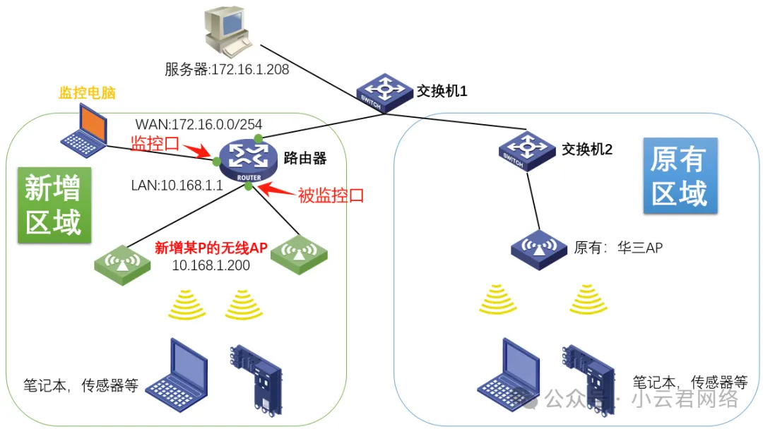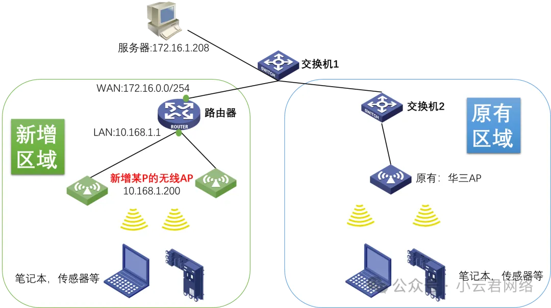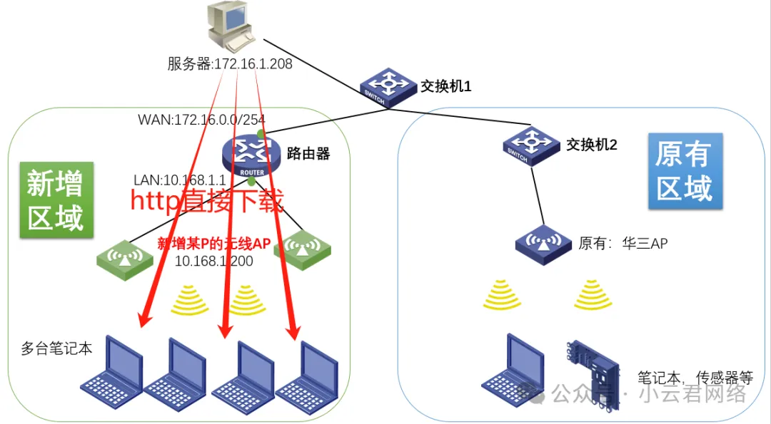 1. 简化拓扑如下:现场传感器设备的升级方式都是通过HTTP协议下载文件到内部完成升级的。HTTP服务器是固定的172.16.1.208。但是新增区域下的传感器无法并发(多台)升级,而原有区域的传感器怎可以同时多台一起升级。如下: