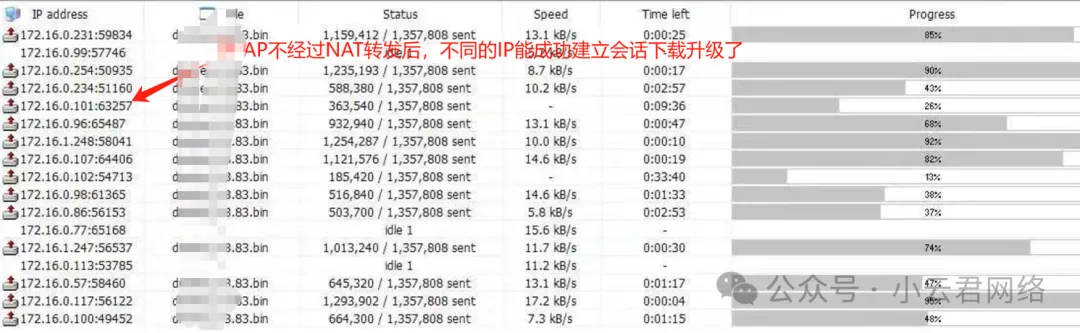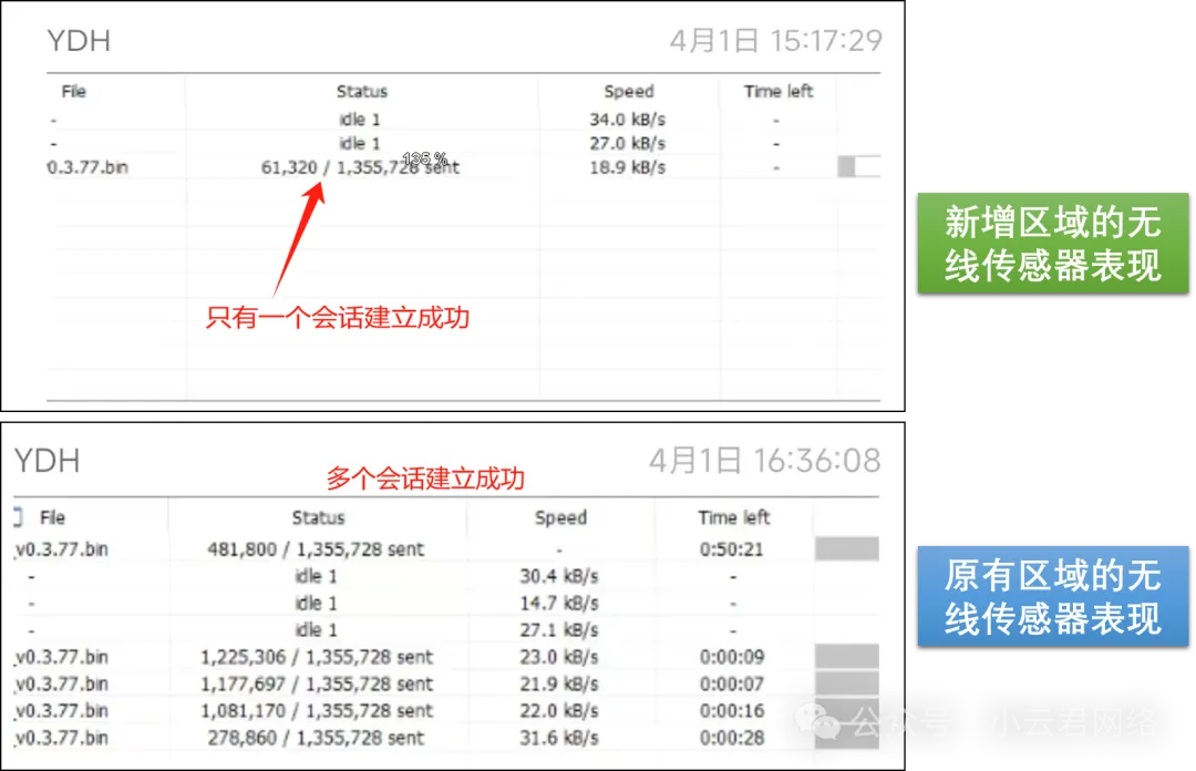 服务器—二层网络—华三AP ))(( 多台传感器,并发下载升级文件正常服务器—二层网络—某J AP ))(( 多台传感器,并发下载升级文件正常四、问题总结和解决方案