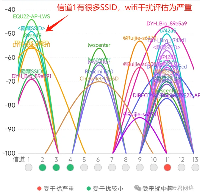 第四步:确认无线干扰由于是2.4G无线接入使用,故首先怀疑竞争干扰导致,现场可以明显看到同信道造成的强干扰,新增AP和H3C AP所在的工作的1信道存在很多SSID,评估存在多方竞争干扰: