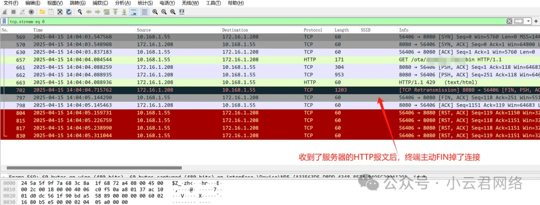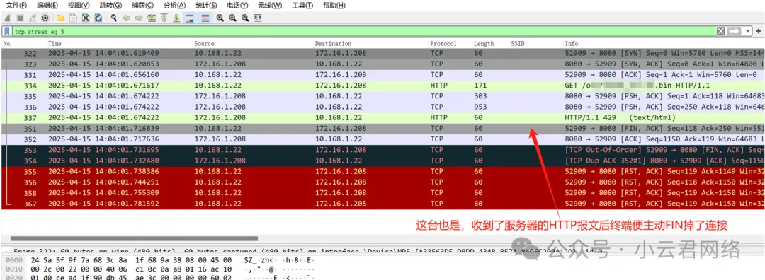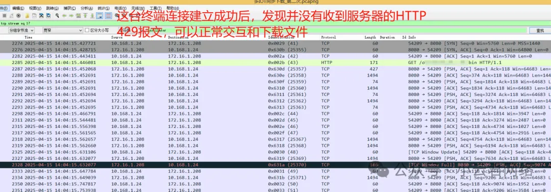 异常的TCP握手成功后,终端请求下载时会收到服务器的HTTP 429报文,然后就主动FIN掉该连接了,并不存在丢包问题。所以大致判断无线链路和有线链路的通信质量是正常的。对比,我们来看看正常的数据流,服务器并没有回复HTTP 429报文: