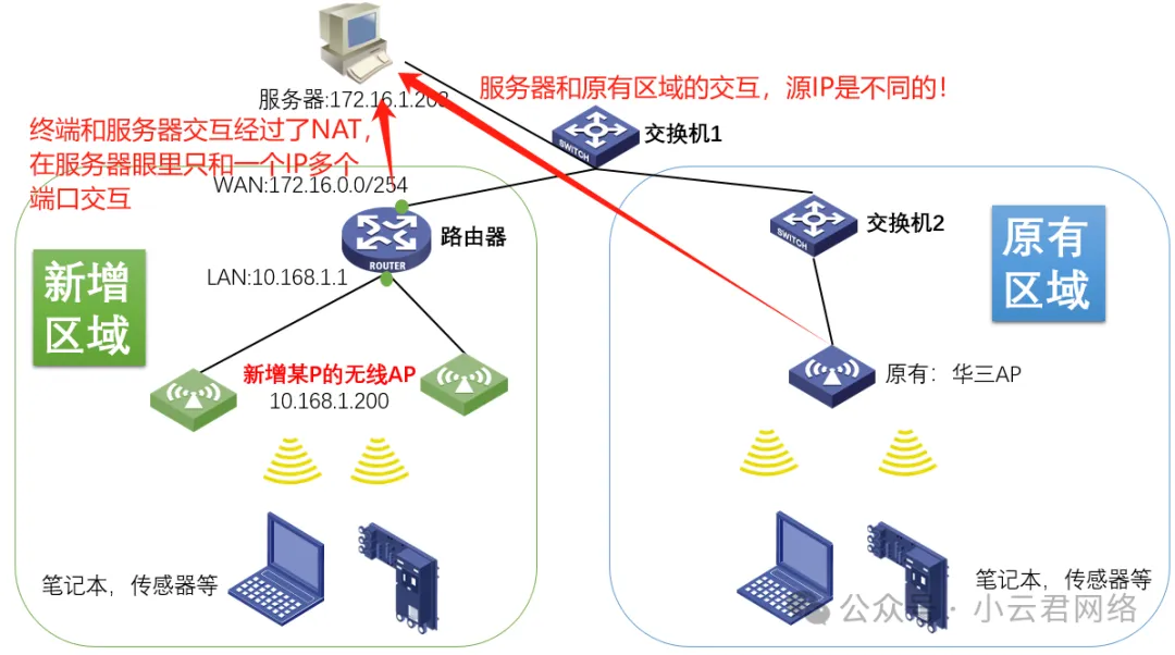 H3C也是多终端接入啊,为什么那边服务器不拒绝,而新增AP则拒绝呢?通过现场的全局摸排,发现H3C AP和新增AP实际所处的位置是不一样的!新增AP加了二级路由器是经过NAT的,而H3C AP没有!如下: