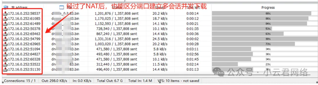 所以合理怀疑HTTP服务器与终端建立会话只认源IP,经过了NAT后就只有1个源IP和服务器交互了,所以只能一对一,因此做了如下有效的对比测试: