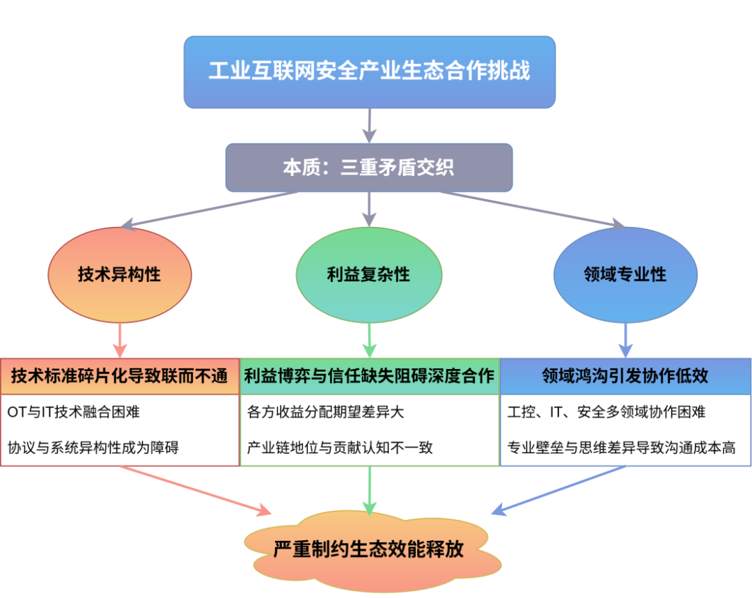 在工业互联网安全产业生态中,尽管各类厂商在各自领域具备独特优势,但生态合作并非一帆风顺,面临着诸多严峻挑战。工业互联网安全生态的协同困境,本质是技术异构性、利益复杂性、领域专业性三重矛盾的交织,严重制约生态效能的释放。这种结构性矛盾不仅阻碍单一项目的推进,更威胁到整个产业生态的可持续发展。