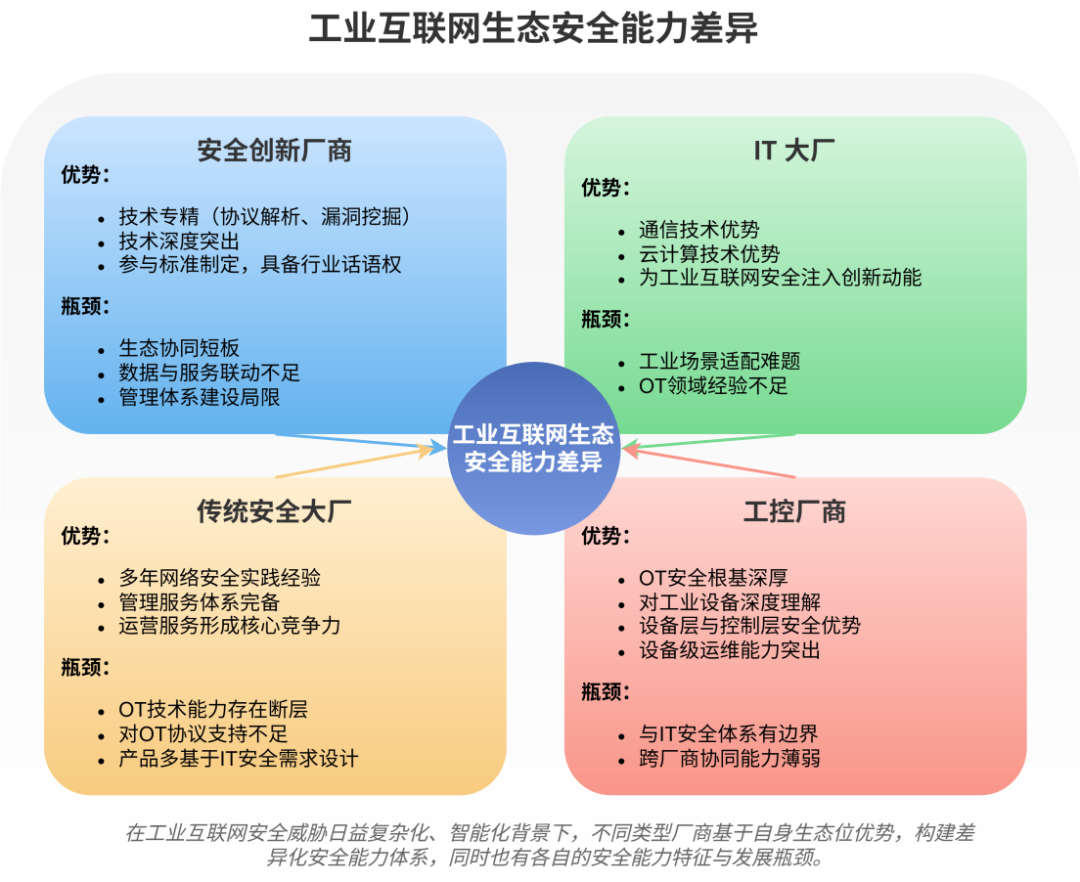 在工业互联网安全威胁日益复杂化、智能化的背景下,不同类型厂商基于自身生态位优势,构建差异化的安全能力体系。