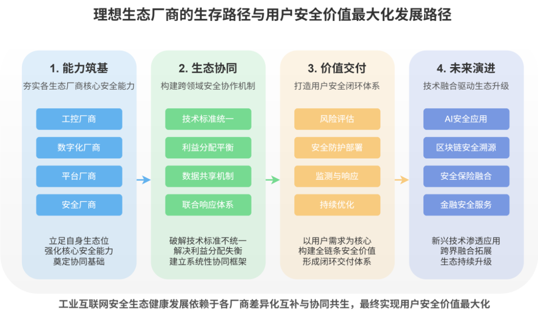 综上,工业互联网安全生态的健康发展,依赖于工控、工业数字化、工业互联网平台、工控安全等领域厂商的差异化互补与协同共生。基于生态全景中各厂商的定位与能力优势,需构建系统性的发展路径,以实现生态位的精准适配,推动工业互联网安全生态向理想状态演进,最终达成用户安全价值的最大化。