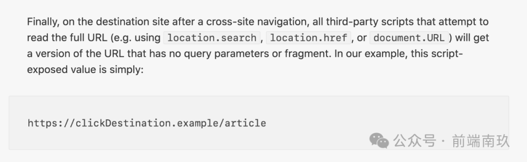 翻译过来就是:在跨站导航后的目标网站上,所有尝试读取完整 URL或参数 的第三方脚本(例如使用 location.search、location.href 或 document.URL)都将获得一个不含查询参数或片段的 URL 版本。