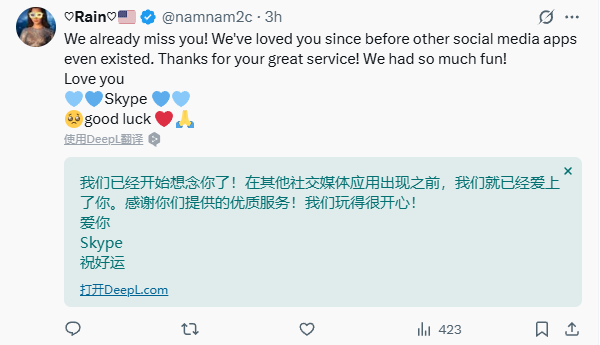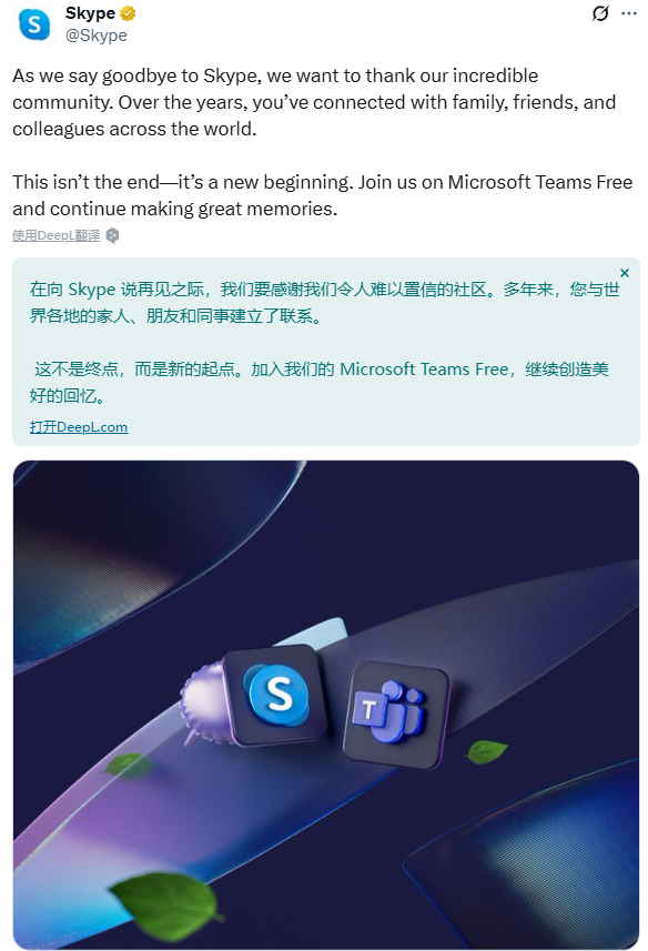Skype在X上发布最后的告别贴,推荐用户转向自家的Team应用: