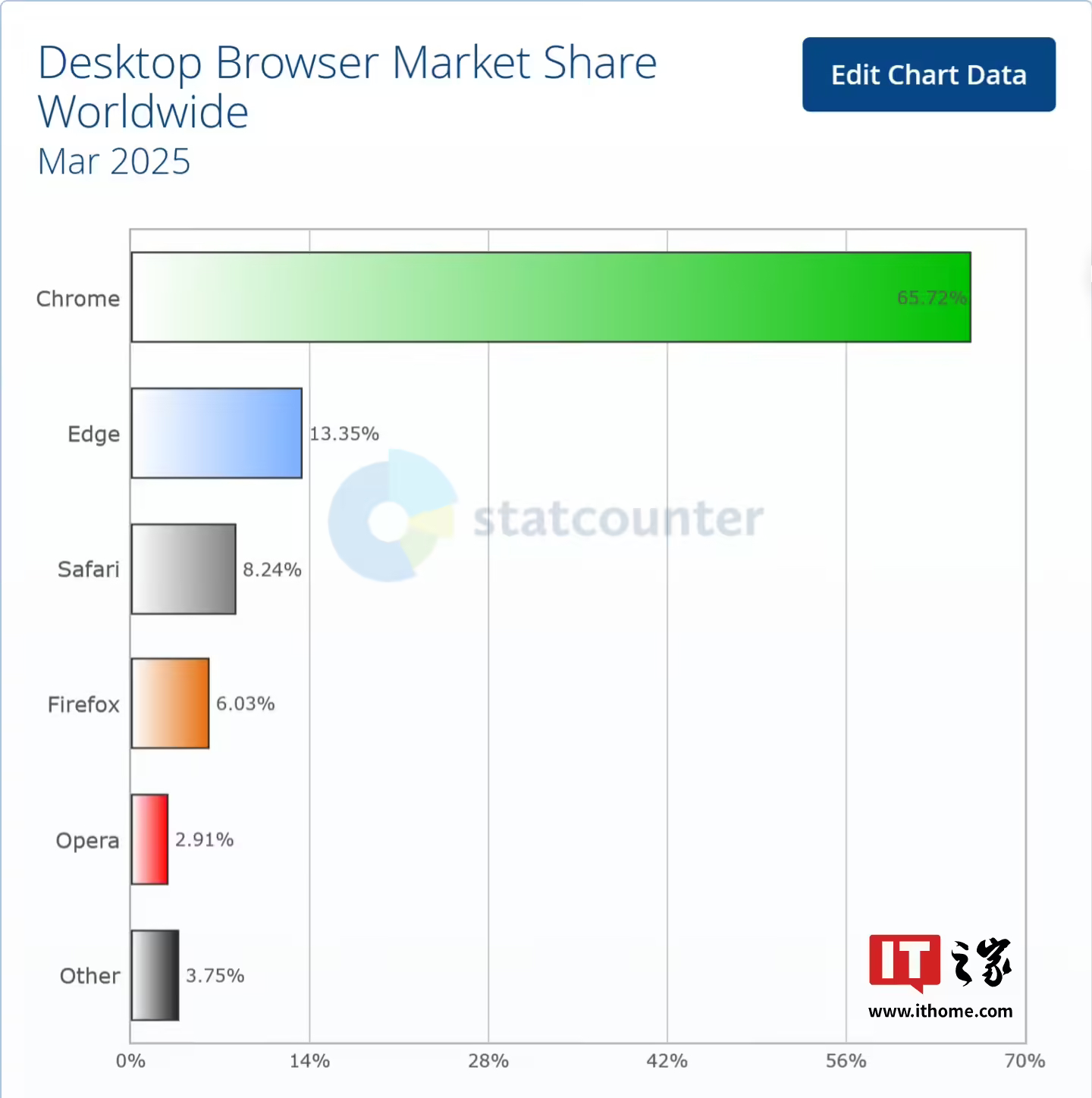 4 月 1 日消息,根据市场调查机构 Statcounter 公布的最新报告,2025 年 3 月谷歌 Chrome 浏览器以 66.16% 的市场份额稳居第一,苹果 Safari 浏览器以 17.62% 位居第二、微软 Edge 浏览器以 5.17% 位居第三。