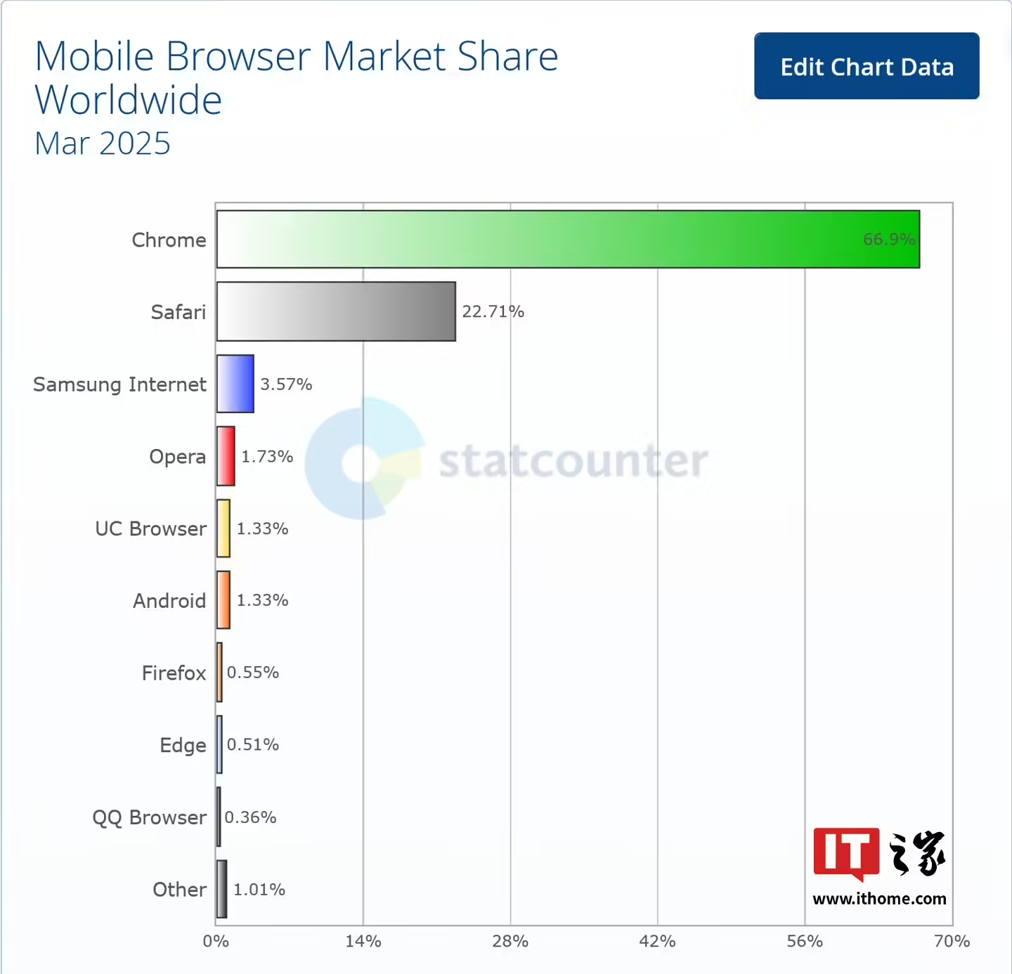 Chrome 在 3 月凭借 66.9% 的全球份额排名第一,相比上个月(67.25%)下降 0.35 个百分点Safari 在 3 月凭借 22.71% 的全球份额排名第二,相比上个月(23%)下降 0.29 个百分点三星浏览器在 3 月凭借 3.57% 的全球份额排名第三,相比上个月(3.7%)下降 0.13 个百分点Opera 浏览器在 3 月凭借 1.73% 的全球份额排名第四,相比上个月(1.66%)增加 0.07 个百分点UC 浏览器等瓜分了剩余市场份额。