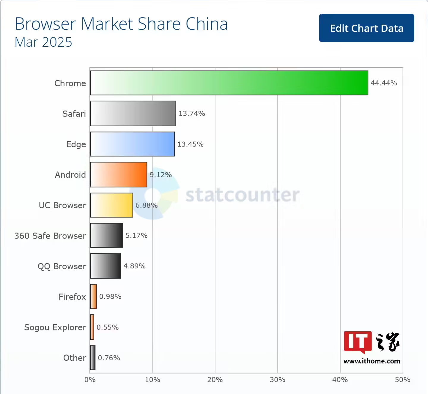 Chrome 在 3 月凭借 44.44% 的全球份额排名第一,相比上个月(44.31%)增加 0.13 个百分点Safari 在 3 月凭借 13.74% 的全球份额排名第三,相比上个月(13.79%)下降 0.05 个百分点Edge 在 3 月凭借 13.45% 的全球份额排名第二,和上个月(13.43%)增加 0.02 个百分点安卓浏览器在 3 月凭借 9.12% 的全球份额排名第四,相比上个月(8.82%)增加 0.3 个百分点UC 浏览器在 3 月凭借 6.88% 的全球份额排名第四,相比上个月(6.98%)下降 0.1 个百分点360 安全浏览器、QQ 浏览器和 Firefox 浏览器等瓜分了剩余市场份额。