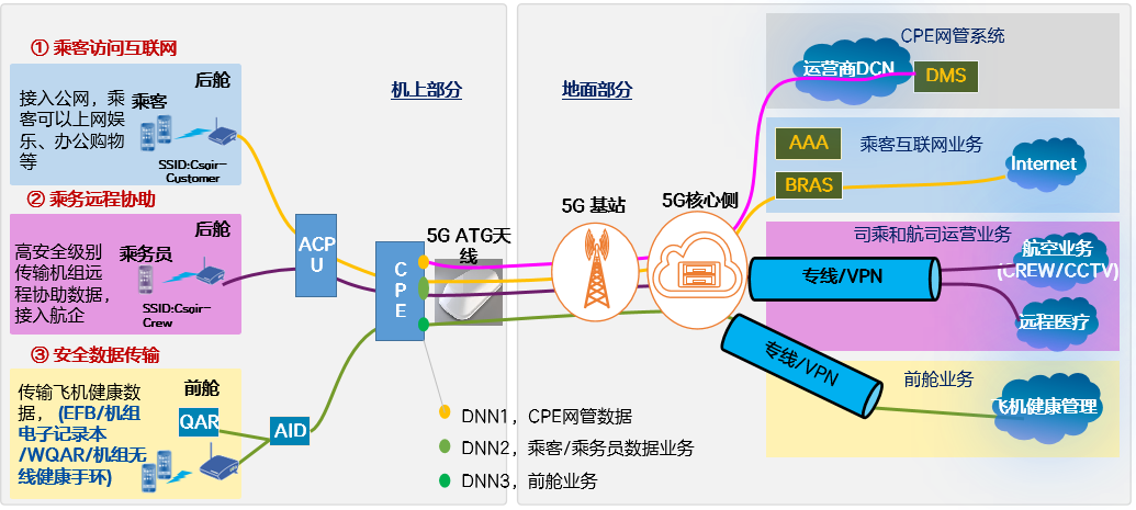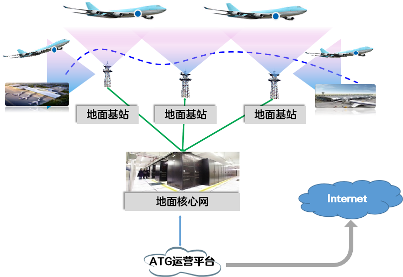 ATG(Air To Ground):利用移动蜂窝技术,沿航线建设对空覆盖基站,实现飞机-地面网络的直接通信,通信距离短、频谱效率高,时延小、带宽大、成本低,可用于飞机与地面大带宽的视频等业务数据传输。