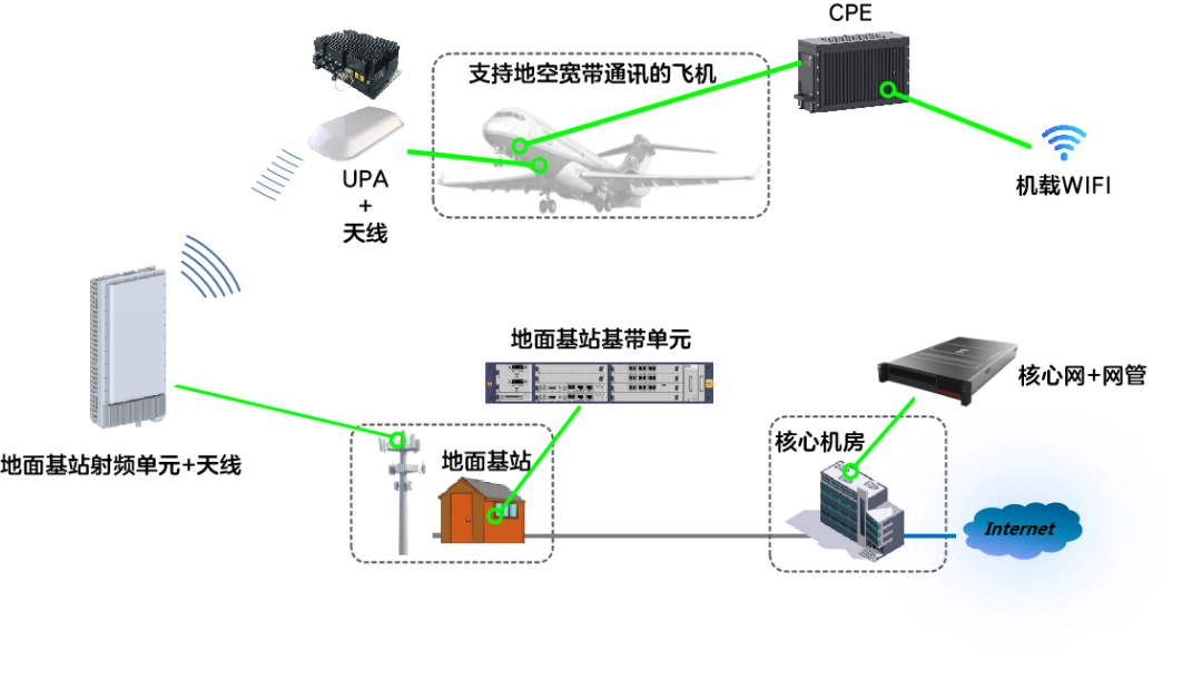 机载通信系统包括机载天线、机载CPE(终端)以及机载WiFi AP。机载CPE系统接入地面5G NR基站,为机上WiFi AP系统进行无线回传,使得机舱内WIFI用户可以进行宽带互联网访问,还可以支持机舱内数据传输到地面。