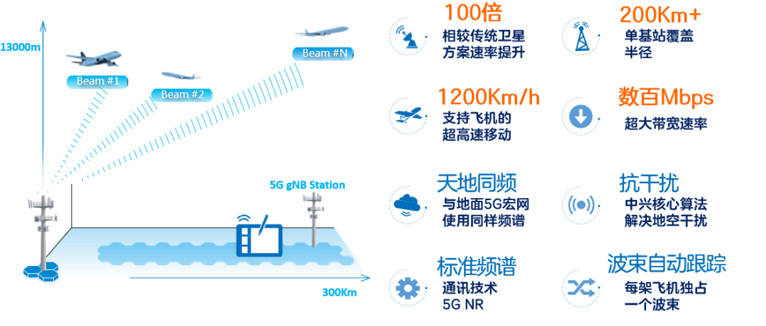 地面网络和空中ATG网络同频技术,实现频谱有效复用。自研航空级CPE、芯片、核心算法,解决高速移动下的多普勒频偏,支持1200km/小时的超速度飞行以及200km以上的超广覆盖半径。5G ATG使用最大100M带宽,最高达数百兆下行速率。采用Massive -MIMO技术,每架飞机独占一个Beaming,单小区多架飞机接入。机载天线与地面定制AAU配合,实现智能波束双向跟踪。图片