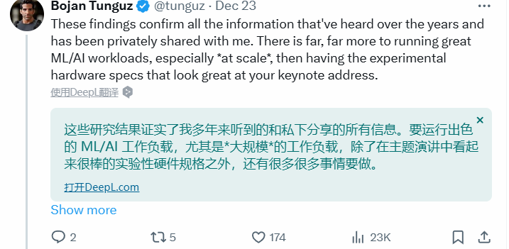 仅从理论上的FLOP/s和HBM带宽/容量进行比较,就像仅凭相机的像素数来评估相机性能一样。真正判断性能的唯一方法是运行实际的基准测试。Nvidia的“开箱即用”性能和用户体验非常出色,我们在基准测试中没有遇到任何Nvidia特有的Bug。Nvidia仅安排了一名工程师为我们提供技术支持,但由于我们没有遇到Nvidia软件问题,因此几乎不需要额外支持。相比之下,AMD的“开箱即用”体验非常难以使用,需要相当的耐心和努力才能达到可用状态。在我们的大部分基准测试中,AMD PyTorch公共稳定版本仍然存在问题,需要通过各种变通方法来解决。如果没有AMD多支工程师团队的支持来排查和修复我们遇到的软件问题,AMD的结果会远低于Nvidia的水平。我们与Sustainable Metal Cloud合作,在256块Nvidia H100上运行了非官方的MLPerf训练GPT-3 175B模型,以测试不同VBoost设置的效果。对于AMD而言,其公开稳定版本软件的实际性能远远低于其宣传的理论TFLOP/s。Nvidia的实际性能同样低于宣传的理论TFLOP/s,但差距没有AMD那么大。虽然MI300X的总体拥有成本(TCO)比H100/H200更低,但基于AMD公开稳定版本软件的训练性能在TCO维度上的表现更差。不过,如果使用AMD软件的定制开发版本,情况会有所改变。在训练性能上,MI300X在矩阵乘法微基准测试中的表现较弱,基于AMD公共版本软件的单节点训练吞吐量仍然落后于Nvidia的H100和H200。MI300X的性能受限于AMD的软件。虽然MI300X在BF16开发分支上的性能有所改善,但这些改进尚未合并到AMD内部代码库的主分支中,也没有进入PyTorch稳定版本。在这些改进被合并并发布之前,Nvidia的下一代Blackwell可能已经上市了。AMD的训练性能还受到MI300X扩展性能较弱的限制。这是由于其ROCm计算通信库(RCCL)的弱点,以及与Nvidia相比,AMD在网络和交换硬件的垂直整合程度较低。而Nvidia通过其Nvidia集体通信库(NCCL)、InfiniBand/Spectrum-X网络结构和交换机实现了高度的整合。AMD的许多AI库是Nvidia AI库的分支版本,这导致了次优的结果和兼容性问题。AMD的客户通常仅在推理时使用手工优化的内核,这意味着其性能仅限于非常狭窄且定义明确的用例,而在快速变化的工作负载下缺乏灵活性。