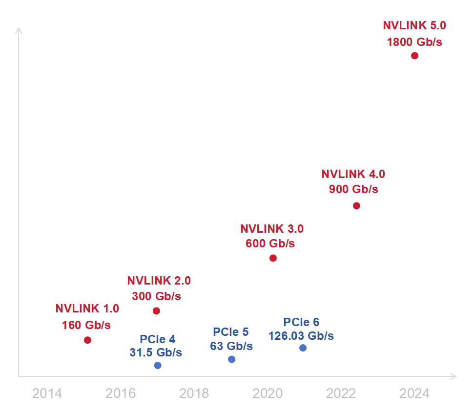 2014年,英伟达为了解决这个问题,专门推出了自家私有的NVLINK总线协议。NVLINK允许GPU之间以点对点方式进行通信,速度远高于PCIe,时延也低得多。