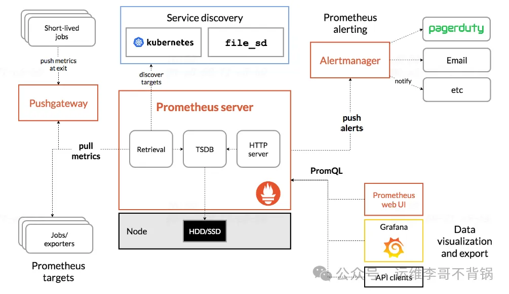 Prometheus 采用 拉取(Pull)模式,即 Prometheus Server 主动从目标端(如应用、主机)拉取监控数据,并存储在本地时间序列数据库中。同时,它提供了强大的查询语言 PromQL,用于数据分析和可视化。Prometheus 采用无中心化的架构,不依赖外部数据库,适合云原生环境。