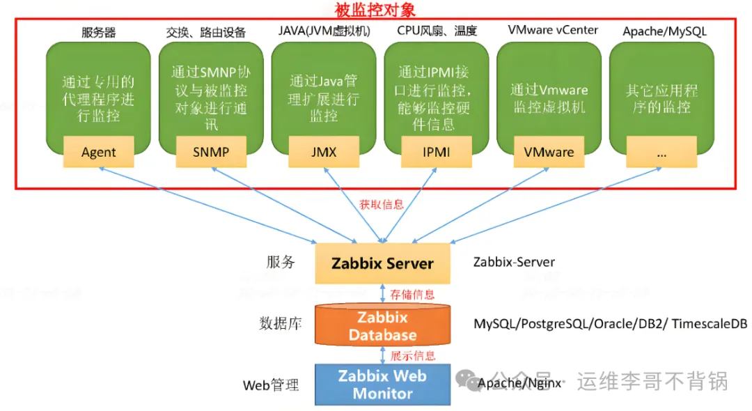 Zabbix 采用 推送(Push)模式,即被监控端(Agent)主动将数据推送到 Zabbix Server,数据随后存储在关系型数据库(如 MySQL、PostgreSQL)中。Zabbix 还支持 SNMP、IPMI 及 JMX 监控,并通过 Web 界面进行管理。