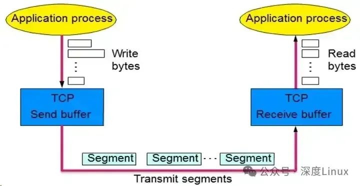 应用层的数据放在write bytes中,通过应用程序将write bytes写入TCP Send buffer,TCP Send buffer里面是以Segment的形式来存储的,TCP进行发送的时候首先进行分段,数据发送出去后,接收方首先也会将接收到的这些段存储到接收缓存区里,应用程序可以调用相关的函数,从接收缓存区中将数据读出来,读到Read bytes里。数据在send buffer和receive buffer中都是以段的形式存储的。