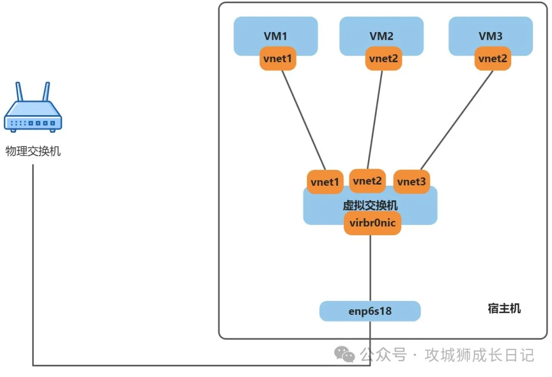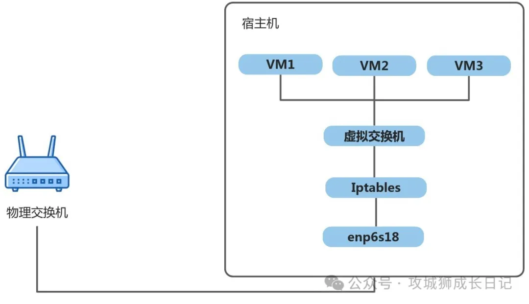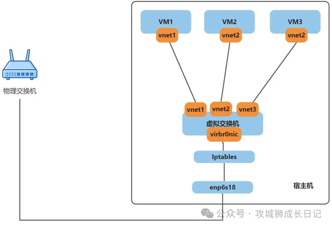 装了KVM之后,它会自动设置一个默认的NAT网络。这样,你的虚拟机就能通过这个NAT网络上网了。这个NAT网络其实就是一个虚拟的交换机加上一些网络规则组成的。听起来可能有点复杂,我们可以通过一张图来更清楚地理解。