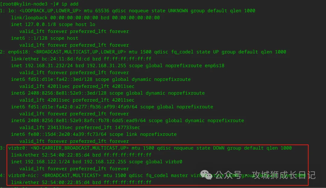 当你启动了ubuntu-cloud虚拟机之后,再次运行ip a命令来检查网络接口的信息时,你会发现比之前多了一个新的网络接口。这个变化如下所示: