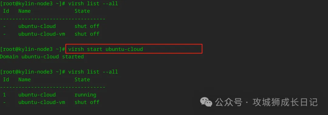 enp6s18是电脑的真实网卡,而virbr0是KVM为默认NAT网络设置的虚拟交换机。使用默认NAT时,虚拟机会连接到virbr0。由于当前没有运行虚拟机,因此看不到网卡变化。如果启动一个虚拟机(如ubuntu-cloud),KVM会为其创建一个新的虚拟网卡。接下来我们通过启动这台虚拟机来看看会发生什么。