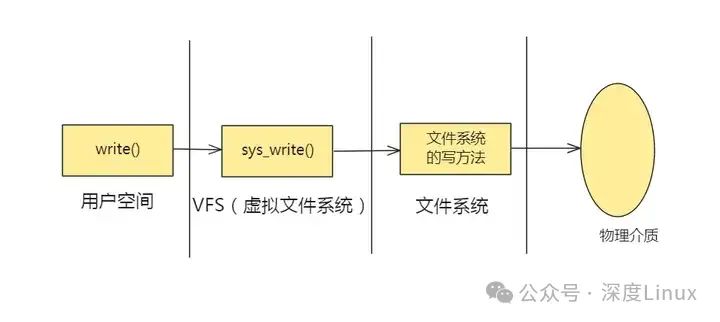 首先,勾起 VFS 通用系统调用sys_write()处理。接着,sys_write()根据fd找到所在的文件系统提供的写操作函数,比如op_write()。最后,调用op_write(