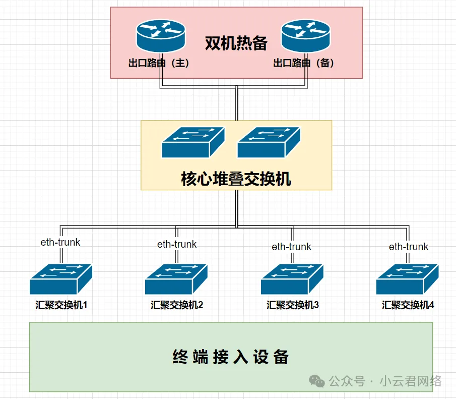 原来单台出口路由改成双机热备并部署BFD;核心采用堆叠交换机替代原有的汇聚交换机,作为VLAN网关和DHCP服务器;核心和汇聚交换机之间做端口聚合eth-trunk接口。基本拓扑如下: