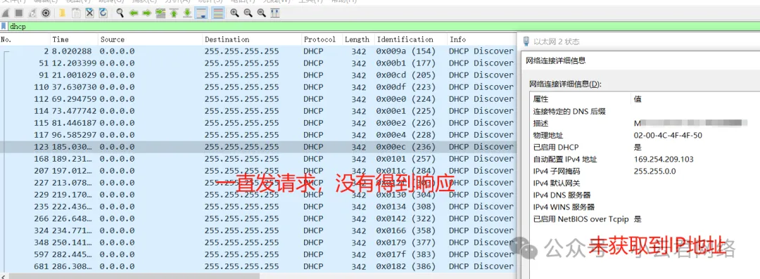 但某楼宇改造变更后,上班高峰期总有用户不到自动获取IP地址或者很艰难才拿到IP,在某获取失败的电脑上抓包和查看网卡信息如下: