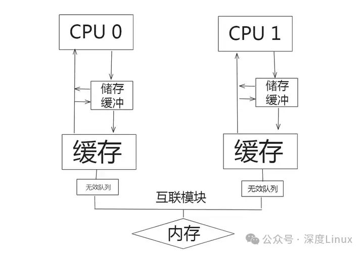 存储缓冲:前面提到过,在写数据之前我们先要得到缓存段的独占权,如果当前CPU没有独占权,要先让系统中别的CPU上缓存的同一段数据都变成无效状态。为了提高性能,可以引入一个叫做存储缓冲(Store Buffer)的模块,将其放置在每个CPU和它的缓存之间。当前CPU发起写操作,如果发现没有独占权,可以先将要写入的数据放在存储缓冲中,并继续运行,仿佛独占权瞬间就得到了一样。当然,存储缓冲中的数据最后还是会被同步到缓存中的,但就相当于是异步执行了,不会让CPU等了。并且,当前CPU在读取数据的时候应该首先检查其是否存在于存储缓冲中。