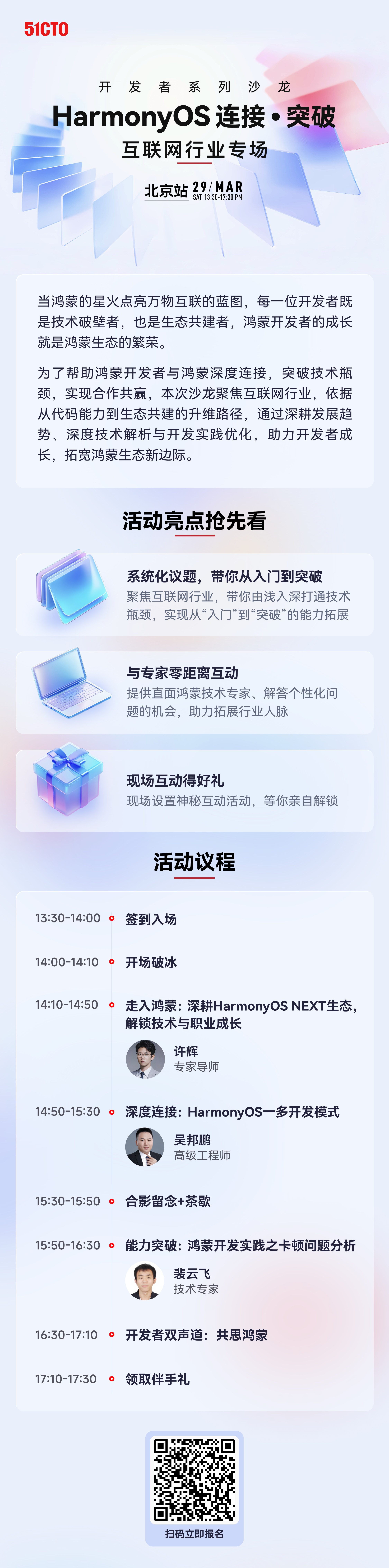 点击链接(https://cloud.51cto.com/act/hmosreg/202503),或扫描下方二维码立即报名,期待与您共同连接鸿蒙技术,突破鸿蒙生态新边界!