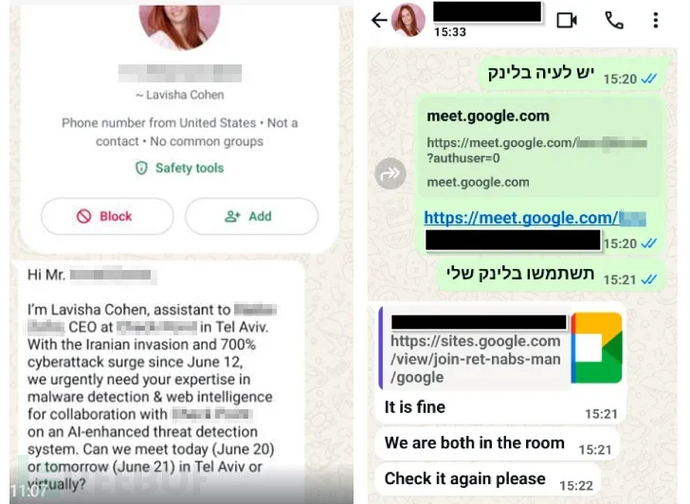 该公司标记的一条WhatsApp消息利用了两国当前的地缘政治紧张局势,诱使受害者参加会议,声称需要他们立即协助开发基于AI的威胁检测系统,以应对自6月12日以来针对以色列的网络攻击激增。